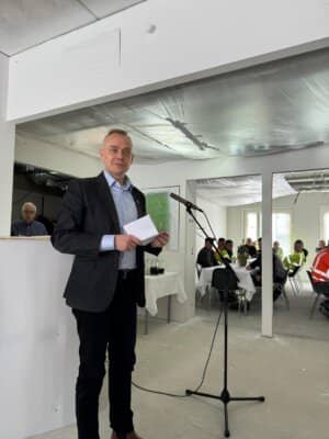 Suomen Hoiva ja Asunto Oy:n Pertti Karjalainen piti harjannostajaisissa puheen talon rakennuttajan puolesta. Talosta tulee monessa mielessä edellä kävijä ja itseasiassa monessa mielessä myös viimeinen lajissaan. Pertti totesikin, että tänään ei tällaista rakentamispäätöstä Hämeessä tehtäisi ja totesi minulle puheessaan, että olimme liikkeellä viime hetkillä. Samasta kiitin häntä omassa puheessani.