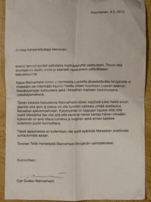Toukokuun 6. päivänä 2012 Carl Gustav Mannerheim vastasi minulle Kauniaisista kirjeitse. Kirje on ainutlaatuinen ja olen lukenut sen kaikkien jahtiemme yhteydessä aina mukana olleille. Niin tein tänäänkin. Liitän tuon arvokkaan kirjeen tähän myös mukaan ja poikkeukselliseksi sen tekee myös se, että suvun vanhin kuoli pian tämän kirjeen lähettämisen jälkeen 26.9.2012. Insinöörinä toiminut Carl Gustaf Mannerheim oli siis aatelismies ja yksi tasavaltamme harvoista kreiveistä, Mannerheim-suvun kreivillisen haaran päämies isänsä jälkeen ja Suomen marsalkan Carl Gustaf Emil Mannerheimin veljenpojanpoika. Hänet tunnettiin pitkään Suomessa suvun puhemiehenä ja näin hän myös tämän Mannerheim-nimen käyttöluvankin kohdalla toimi. Ja teki sen arvokkaasti pohdiskellen miten marsalkka Mannerheim olisi pyyntööni ja kysymykseeni suhtautunut. Pohdinta tuli siis myönteiseen lopputulokseen toisin kuin tilanne missä marsalkka Mannerheimiltä oli aikanaan lounaspöydässä kysytty, että ”Saako marsalkan pöydässä tupakoida?”. Mannerheim oli vastannut, että ”hän ei tiedä, sillä kukaan ei ole koskaan sellaista kysynyt”.